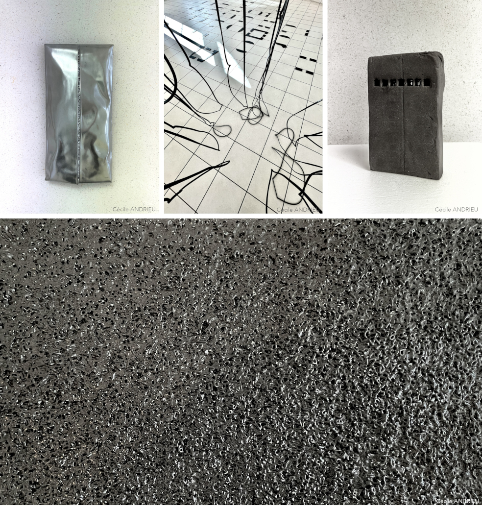 En m’initiant au japonais j’ai vraiment pris conscience du poids des mots dénoncé par Italo Calvino et de la force du silence. Dès lors, travaillant beaucoup avec des textes, livres ou dictionnaires, et des outils liés à l’écriture (papiers, caractères typographiques, mines, craie…), associés parfois au fer, à la chaux au verre, à la pierre comme à des objets préfabriqués je me suis attachée à ex-poser le silence de la lettre écrite ou imprimée avant l’émergence du sens pour tenter une autre façon de « Voir ».
