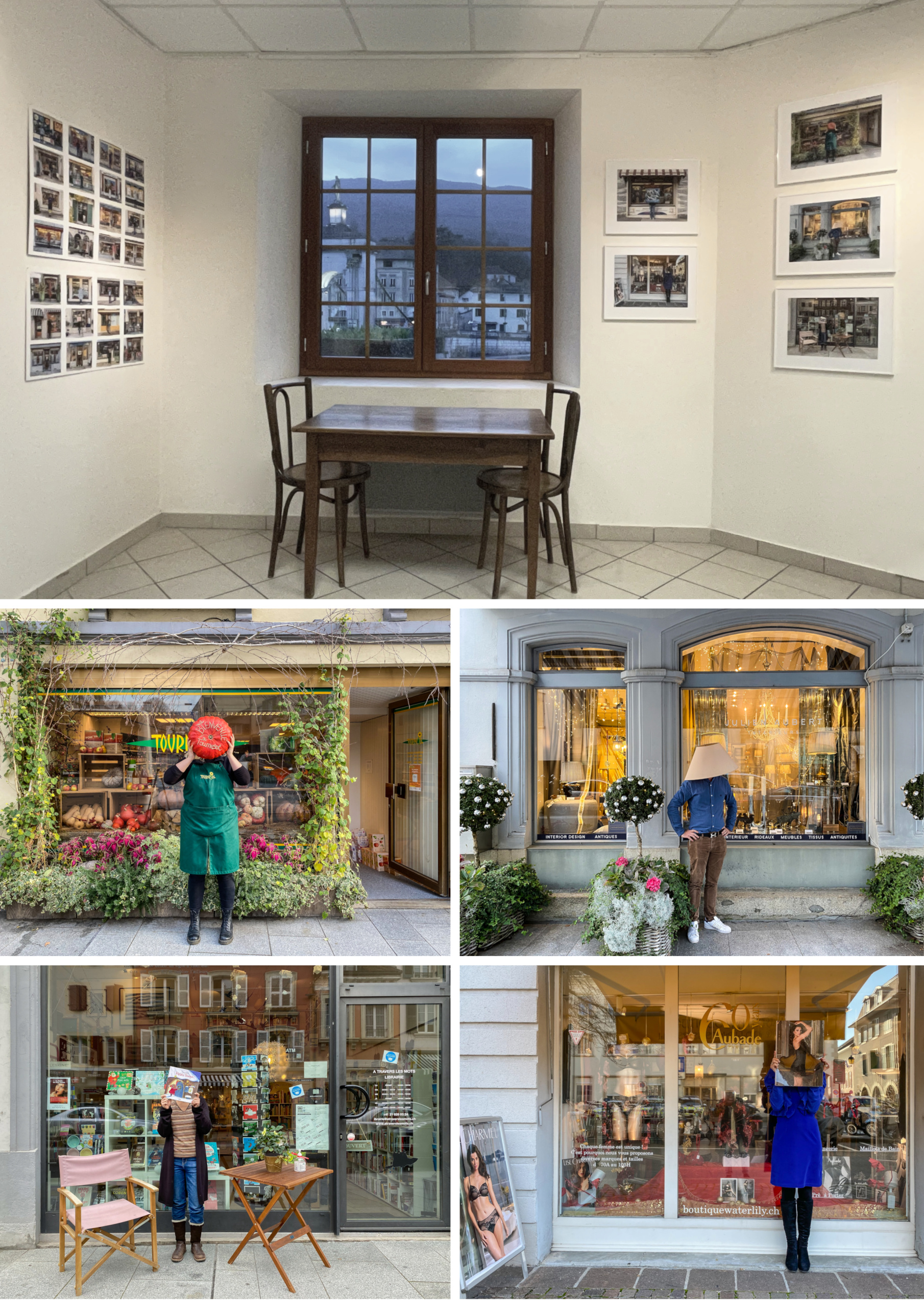 Devant les évidentes difficultés de réaliser cette idée et l’arrivée du Covid, j’ai modifié mon approche : dans chacun des commerces visités, j’ai demandé au vendeur ou à la vendeuse présent(e)s de se placer devant sa vitrine et de cacher son visage (Covid oblige ! ) avec un objet prélevé dans son étalage.