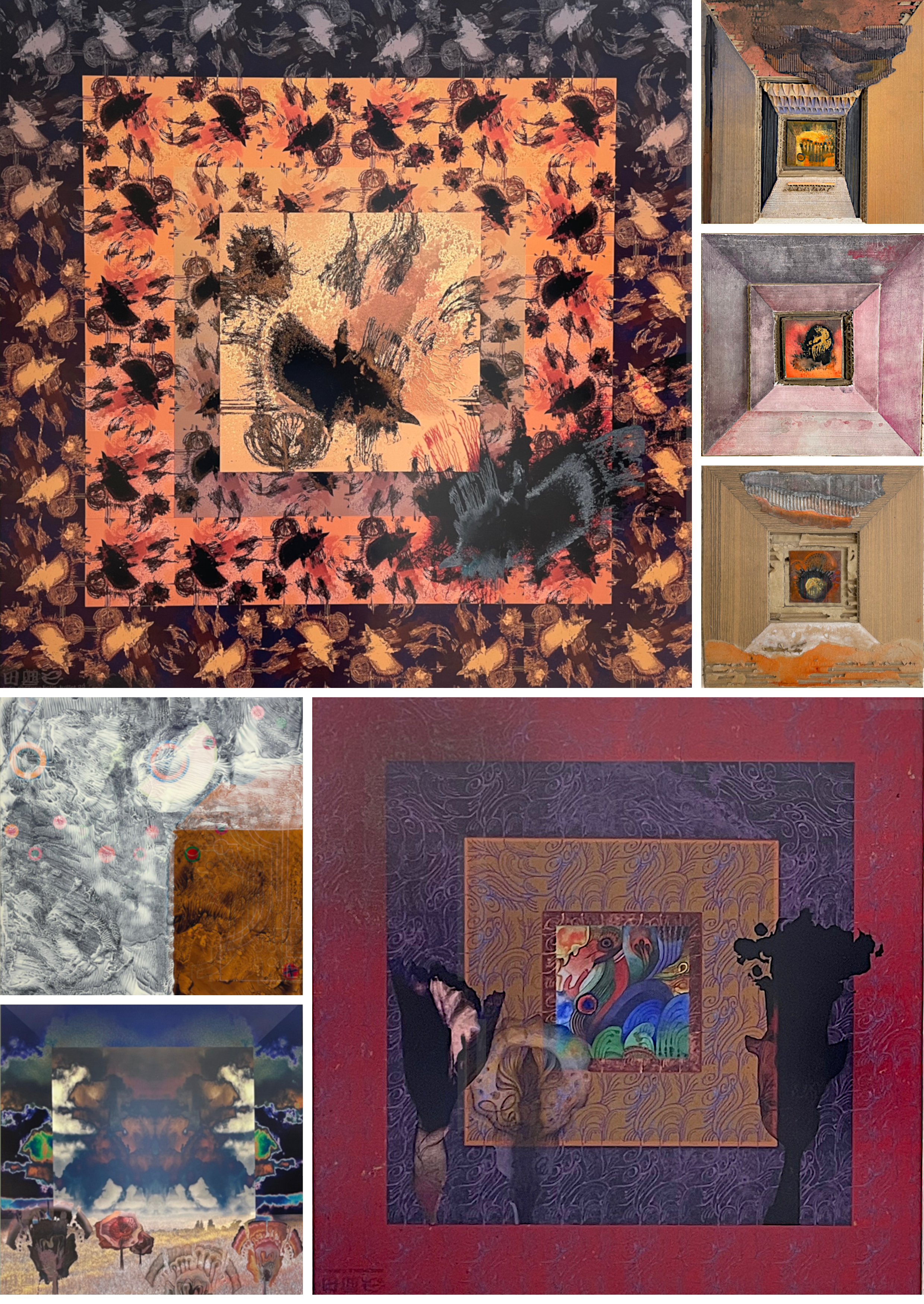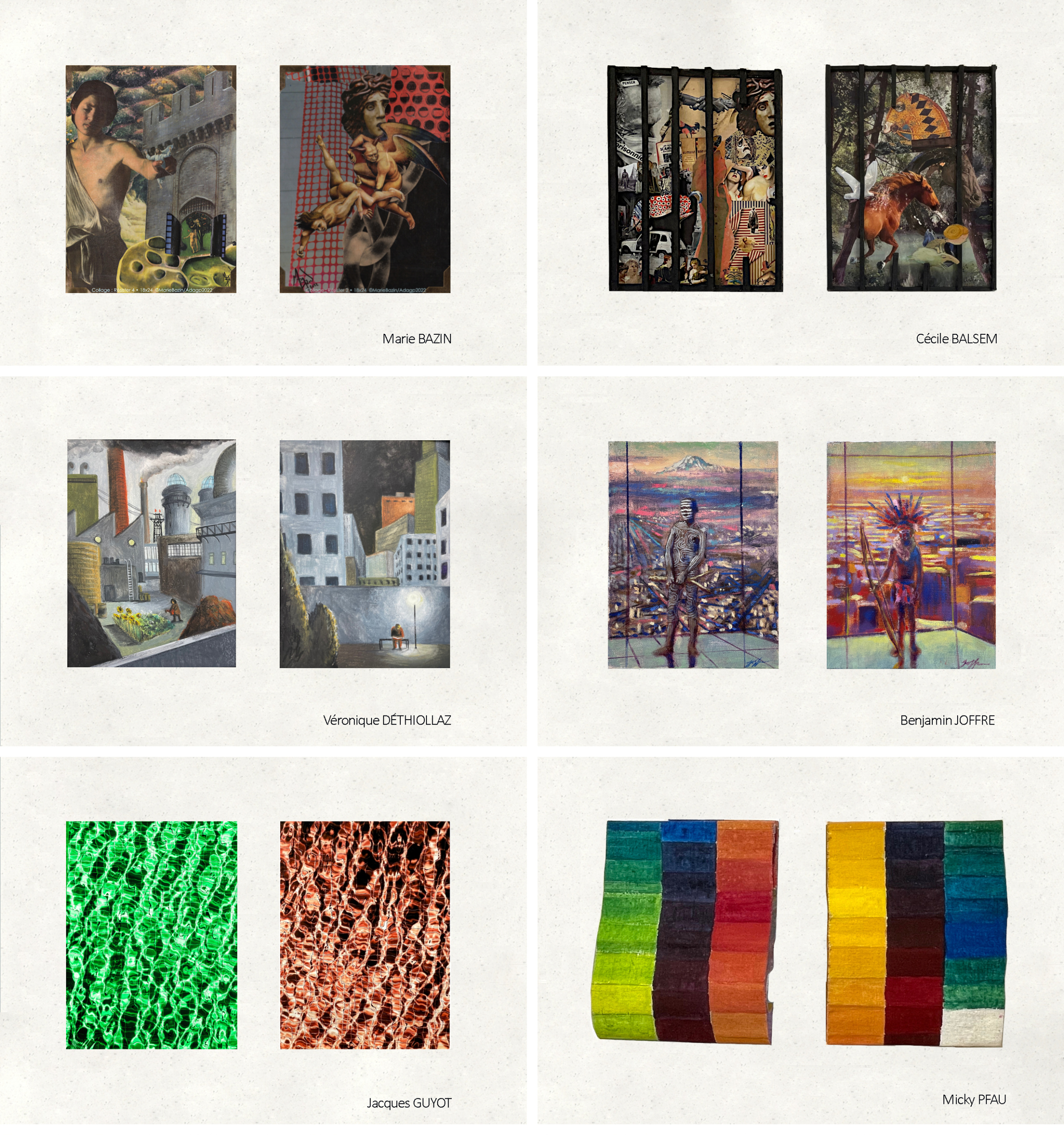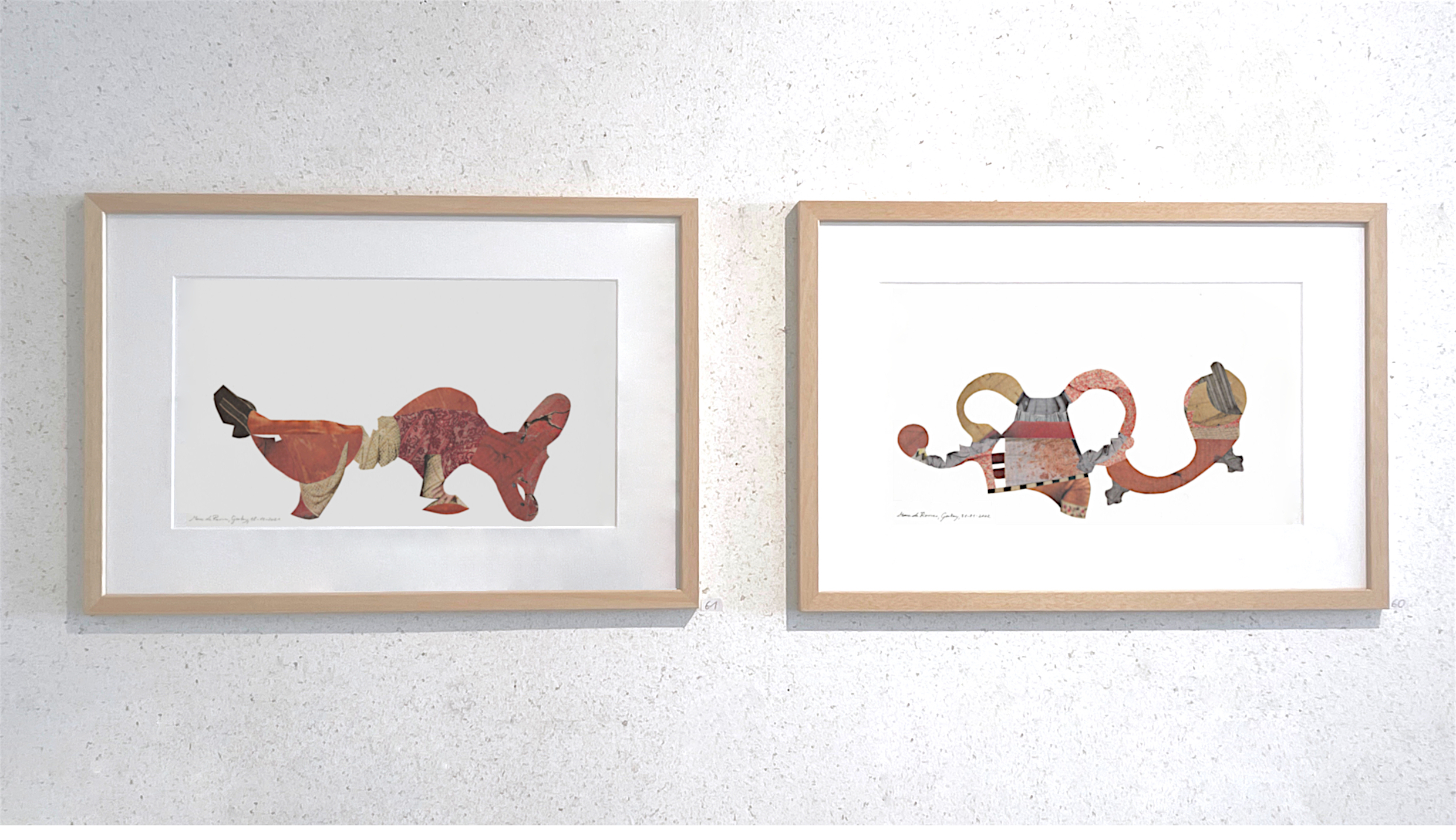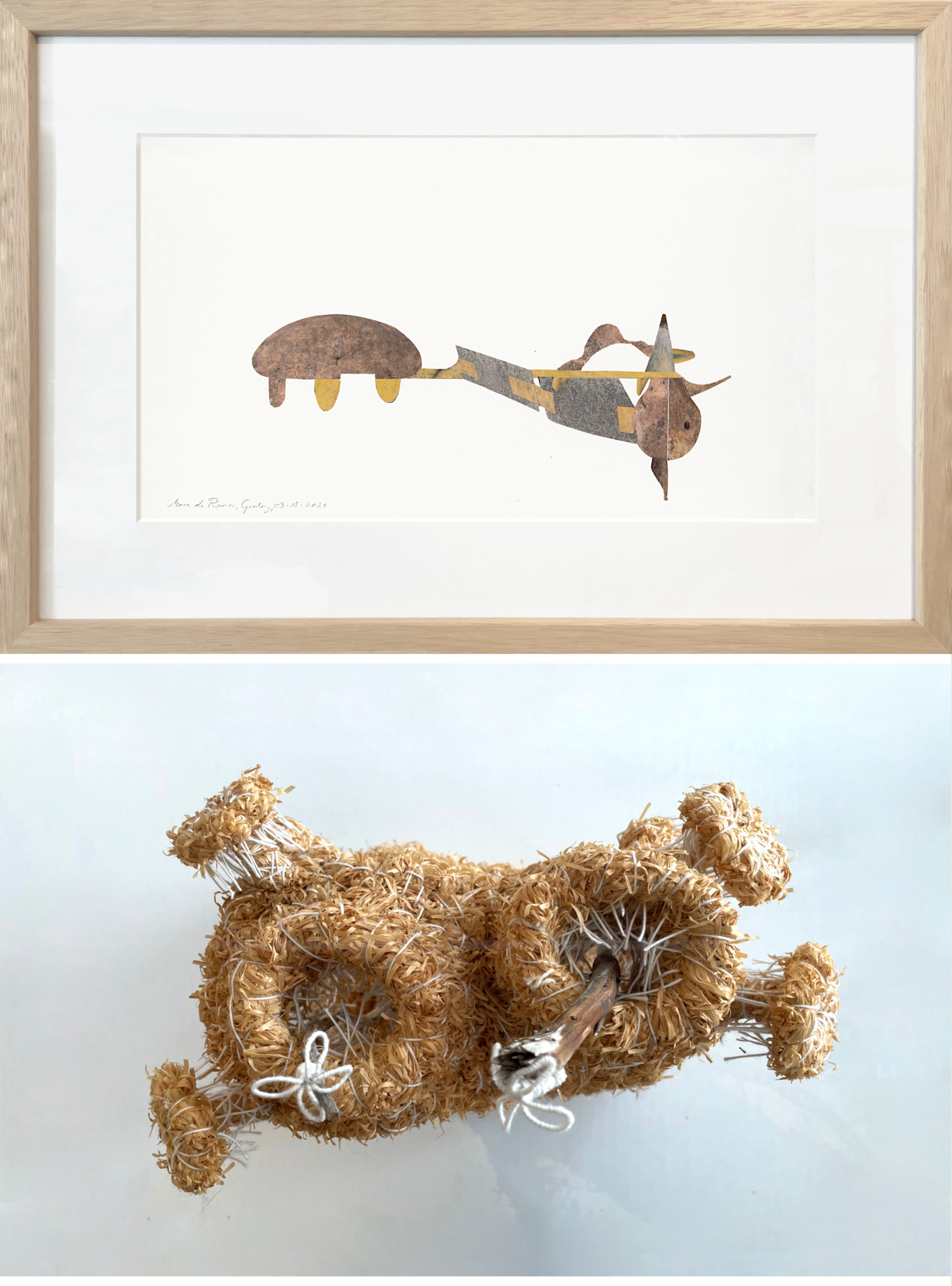 La série de collages, également présentés avec passe-partout, est plus récente, elle a commencé avec le premier confinement et elle continue à élargir. Ce sont des segments de photos de journal collés sur du papier de dessin, protégé par un vernis mat anti UV.