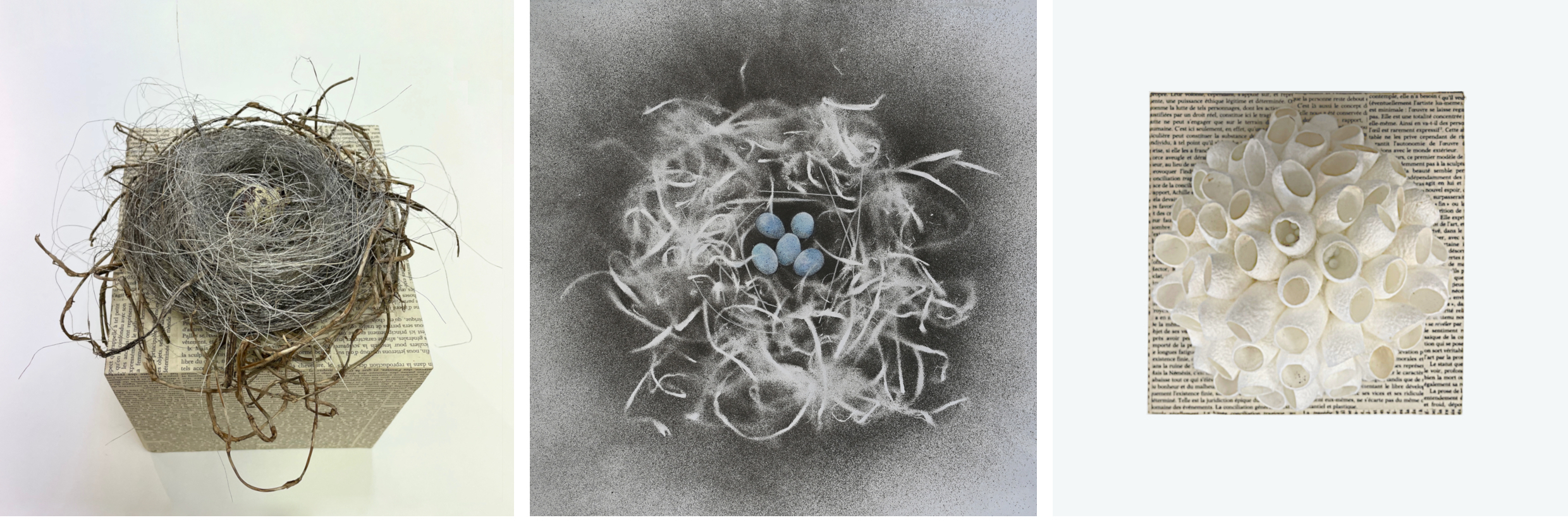 Le monde dans lequel nous vivons me paraît particulièrement inquiétant et les images qui ont surgi en moi se rapportent à la plus grande vulnérabilité de la vie, celle d’une étape qui nécessite une extrême attention pour parvenir à maturité. Par analogie avec tout ce qui est à son commencement et ne peut voir le jour sans une protection attentive, le nid s’est imposé à moi.