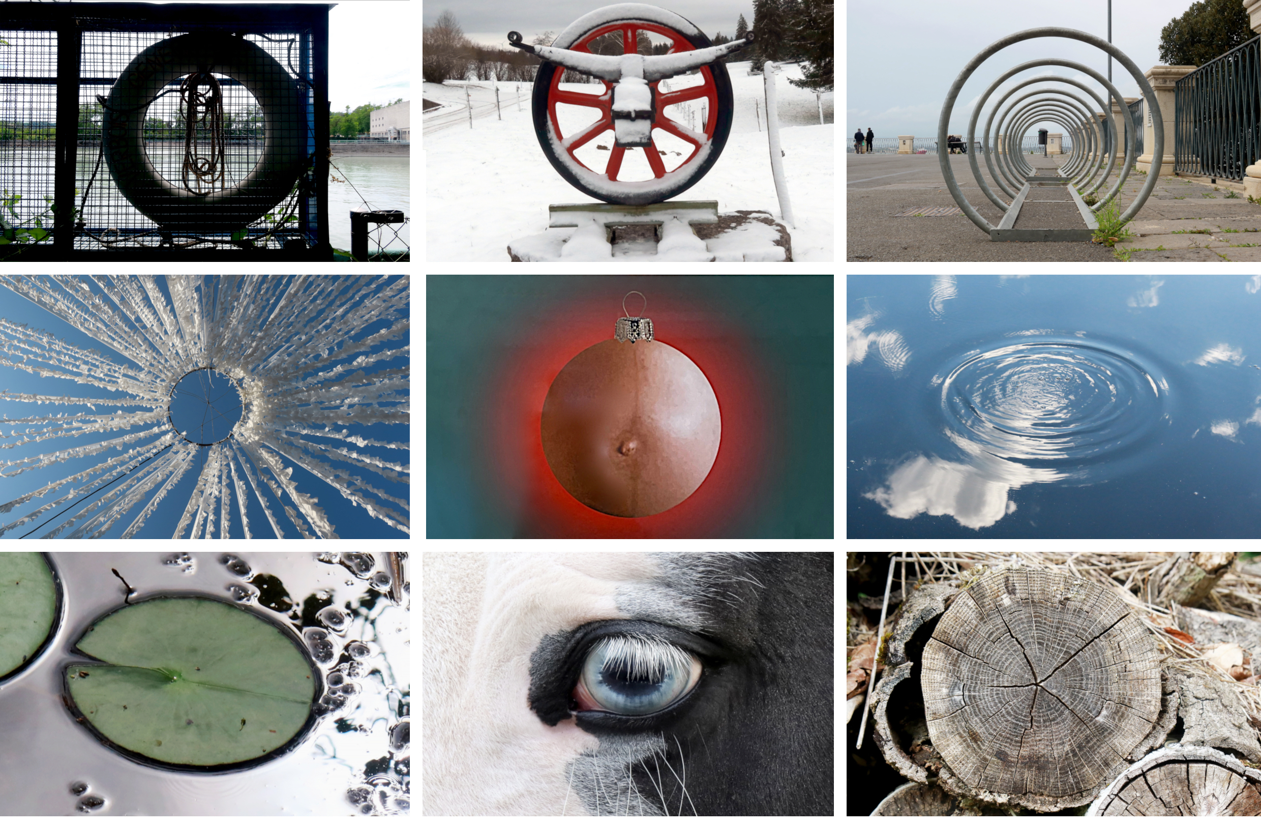 Par la photographie, montrer l’omniprésence de la forme circulaire dans le monde, produite aussi bien par la nature que par la main de l’homme. Au hasard des choses et des noms se constitue le début d’une liste infinie : (par ordre alphabétique) ampoule, anneau, arceau, assiette, auréole, ballon, bidon, bobine, bouée, boule, carrousel, cône, couronne, cuve, entonnoir, encyclie, feuille, flacon, fleur, fruit, horloge, jarre, lune, lustre, marmite, montre, meule, nid, oculus, œil, orbite, parapluie, poêle, puits, roue, rouleau, section, socle, soleil, spirale, table, tambour, tipi, tonneau, trou, tube, ventre, verre, volant, yourte… Chaque élément de cette liste apporte sa pierre à une « rêverie du cercle ».