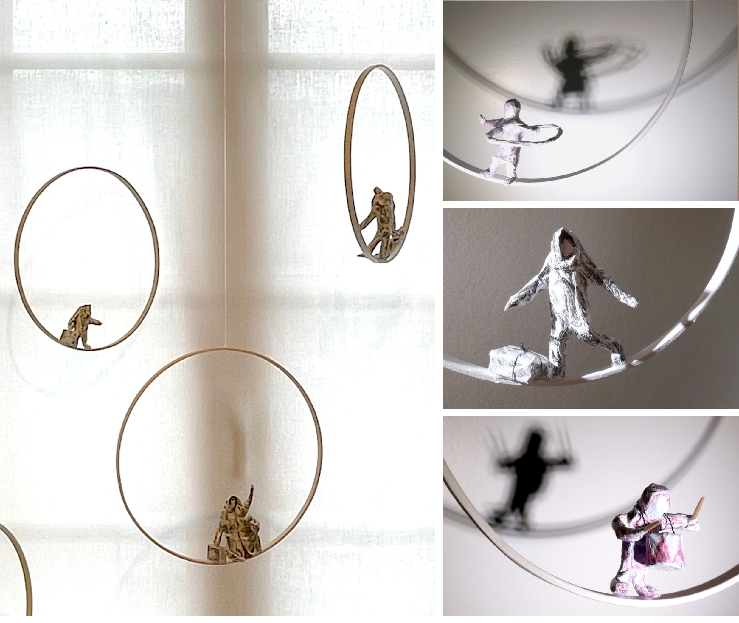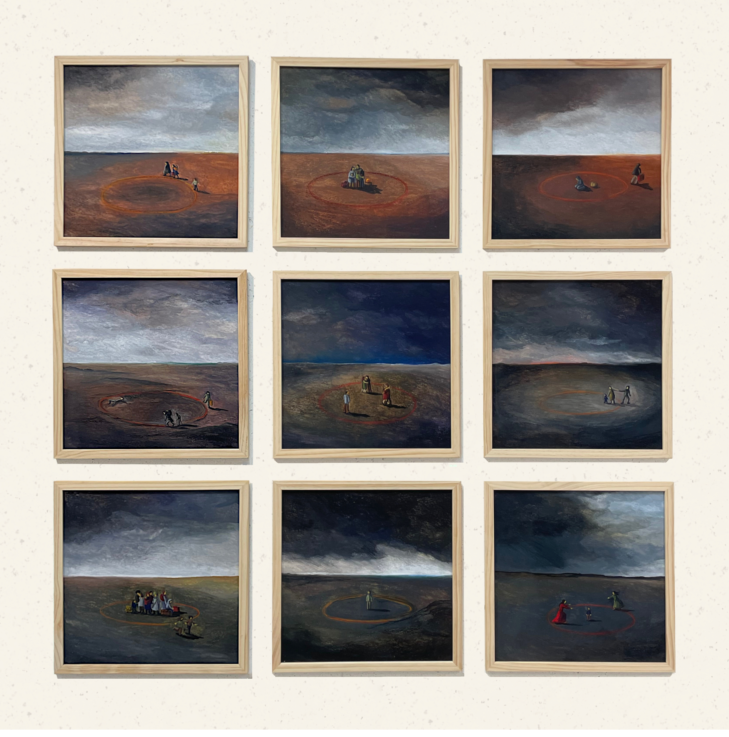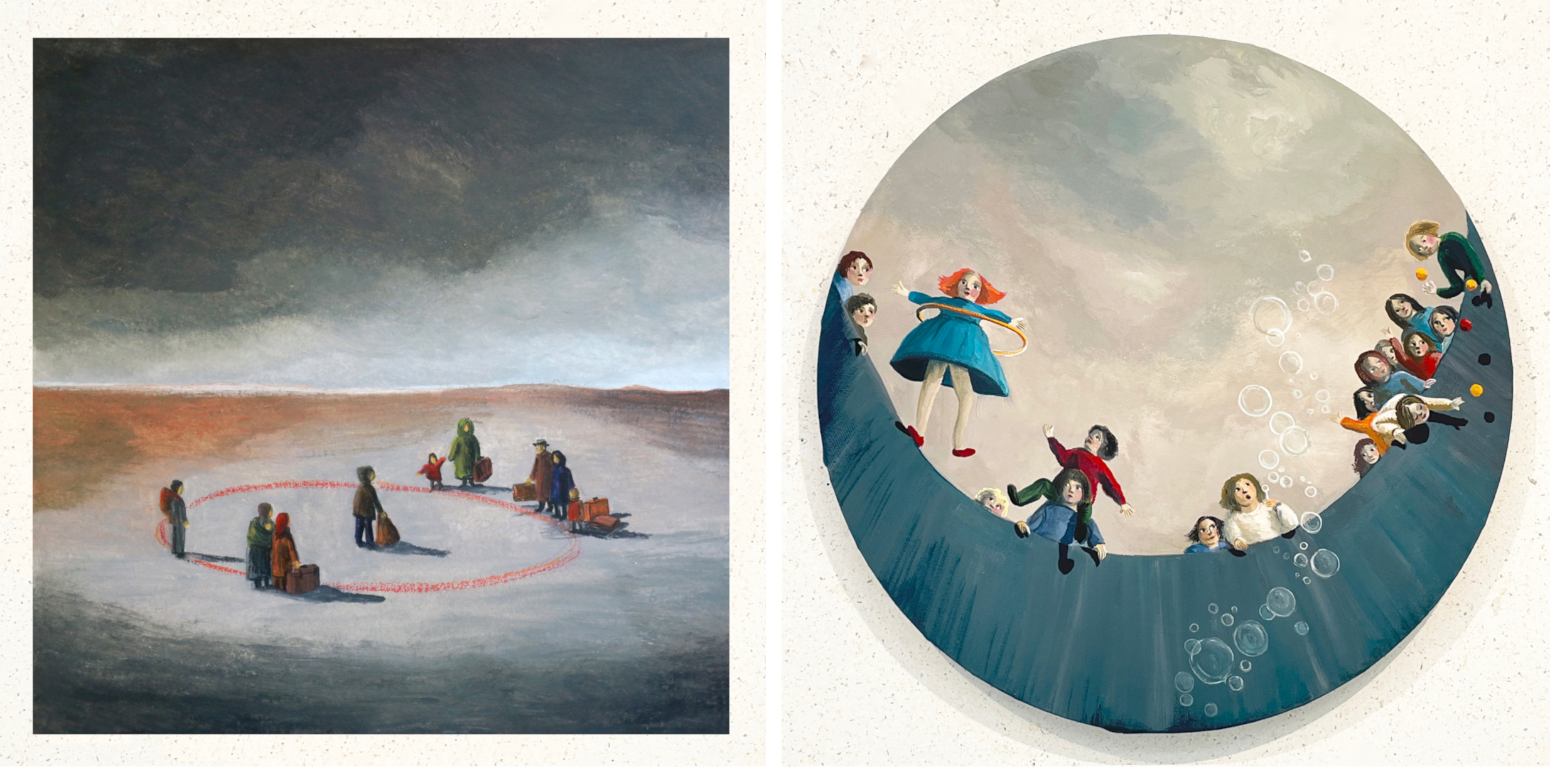 Ces Voyageurs en rond transportent leur fardeau d’exil sur la bordure du chemin. Ils se balancent, ils nous regardent. Vont-ils rester dans le cercle et tourner en boucle, revenant sans cesse sur leur pas ? Ou vont-ils préférer le vertige, franchir cette lisière pour plonger dans le vide ?